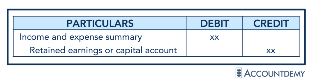 However, if the income and summary account shows a debit balance, then a net loss occurred. The closing entry would then be: