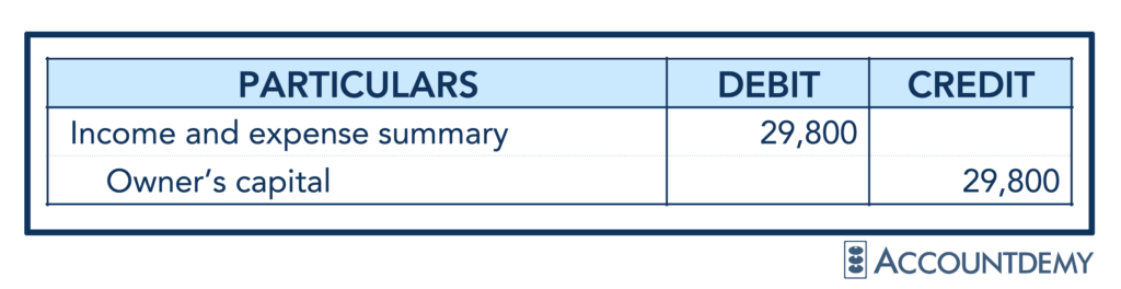 Continuing with the example above, the balance of the income and expense summary account is a credit of $29,800. The entry to close this, assuming that your company is a sole proprietorship, would be: