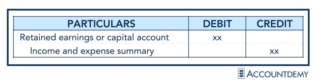 The equity account on which the income and expense summary will be closed may depend on the legal structure of your business. If it is a corporation, then it should be closed to the retained earnings account. However, for a sole proprietorship and partnership, the income and expense summary account is closed to the owner’s or partner’s capital accounts.