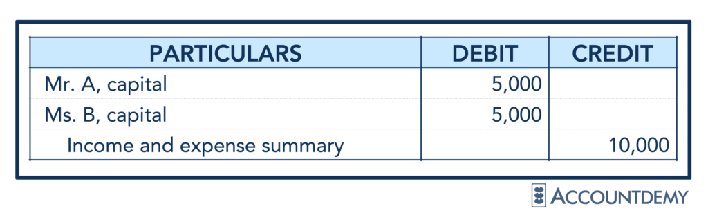 For example, let’s assume that the partnership of Mr. A and Ms. B suffered a net loss of $10,000 during a period. Both partners agreed to share any income or losses equally. The entry to close the income and expense summary account would be:
