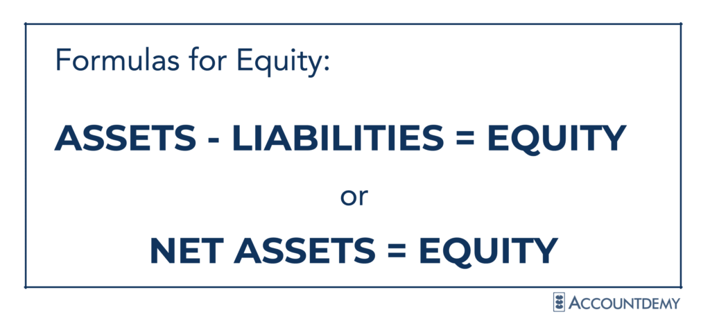 Equity, which is also referred to as Net Assets, is the amount that is due and can be distributed to the owners of the company. It can be emphasized using the formula: