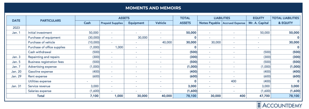 On January 1, 2023, Mr. A opened Moments and Memoirs, a video production company that specializes in wedding video coverage. Below are the initial transactions that he made prior to starting his business operations: